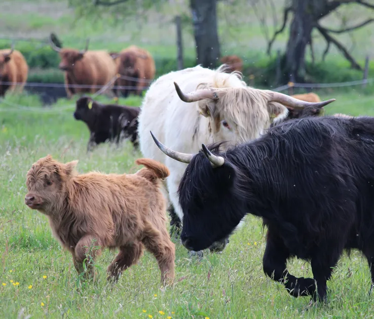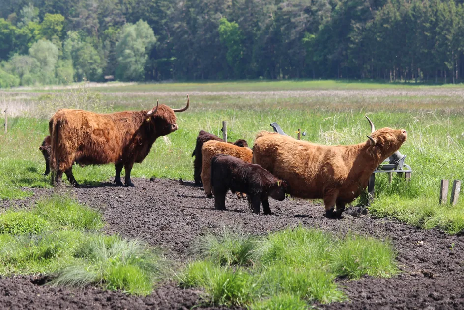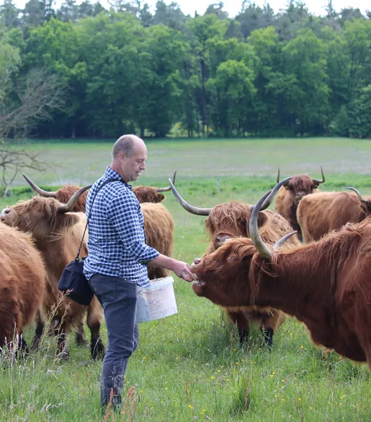 Hier bin ich daheim. Obwohl ich beruflich einen anderen Weg eingeschlagen habe, begleitet mich die Liebe zur Natur und zum naturnahen Leben. 2013 habe ich zum Ausgleich meines hektischen Alltags mit der Zucht der zotteligen Schottischen Hochlandrinder begonnen. Inzwischen ist aus dem Hobby eine Herzensangelegenheit geworden. Neben der Aufzucht der Tiere bewirtschafte ich auch die landwirtschaftlichen Flächen, baue Mais und Getreide an und mache Heu und Stroh für die Versorgung meiner Herde während der Wintermonate. Die Erhaltung und Erweiterung der schützenswerten Landschaft des Forstmoos ist mir wichtig. Mit der Beweidung durch die Rinder profitieren alle davon: die Tiere, die Natur und letztendlich auch der Mensch. Das sieht man und das schmeckt man.