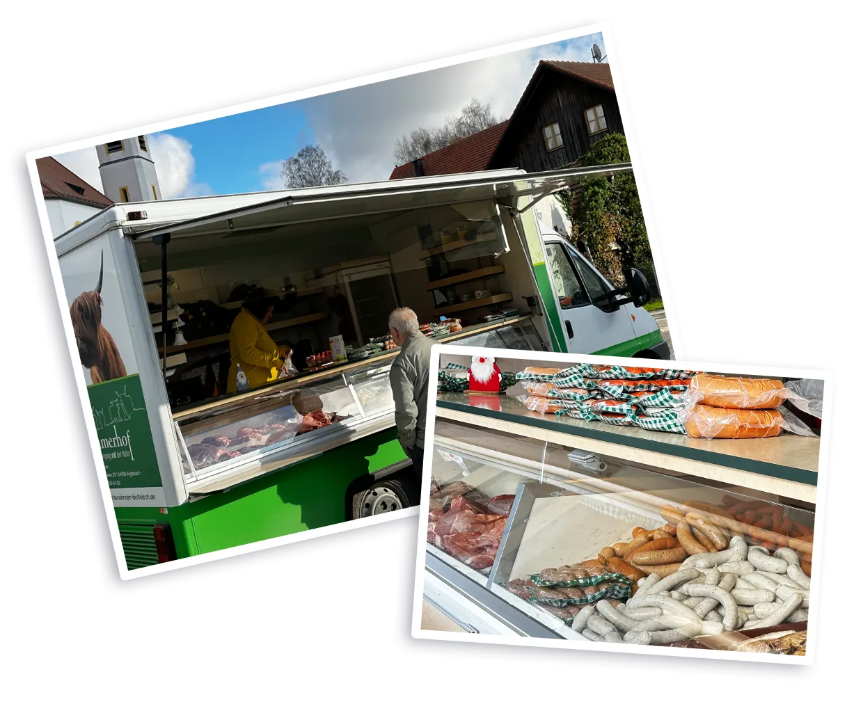 Unseren Verkaufsstand finden Sie an zwei Tagen an verschiedenen Standorten in der Umgebung. Hier bekommen Sie frische Produkte aus unserem eigenen Bio-Rindfleisch und Erzeugnisse aus Schweinefleisch von regionalen Bauern. Unser Metzger verarbeitet alles bei uns auf dem Hof. Neben frischem Fleisch finden Sie bei uns auch Würste roh und geräuchert, feine und grobe Leberwurst, Frischwurstaufschnitt, Griebenschmalz und vieles mehr.